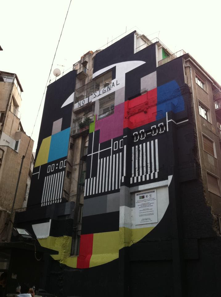 «Νο signal» είναι ο τίτλος του σχεδίου που το κτίριο της οδού Κριεζώτου στο Σύνταγμα, στις παρυφές του Κολωνακίου, κάτω από ένα μικρό δάσος τηλεοπτικών κεραιών. Το γκράφιτι αποτελείται από γεωμετρικά σχήματα που παραπέμπουν σε ηλεκτρονικό υπολογιστή και συμβολίζει την επικοινωνία από την οποία απουσιάζει η ανθρώπινη επαφή. Η παρέμβαση έγινε το φθινόπωρο του 2011 στο πλαισιο του προγράμματος «Εικαστικές παρεμβάσεις στον Δημόσιο Χώρο», που πραγματοποίησε το Υπουργείο Περιβάλλοντος, Ενέργειας και Κλιματικής Αλλαγής του πρώτου από τα τρία γκράφιτι, που εξελίσσονται στην Αθήνα σε συνεργασία με την Ανωτάτη Σχολή Καλών Τεχνών (ΑΣΚΤ).