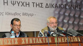 Στο βήμα της συνέντευξης μαζί με τον Βαγγέλη Μπούτα ήταν ο Αλέξανδρος Κολιαβασίλης από το μπλόκο των αγροτών στο αεροδρόμιο «Ελευθέριος Βενιζέλος».